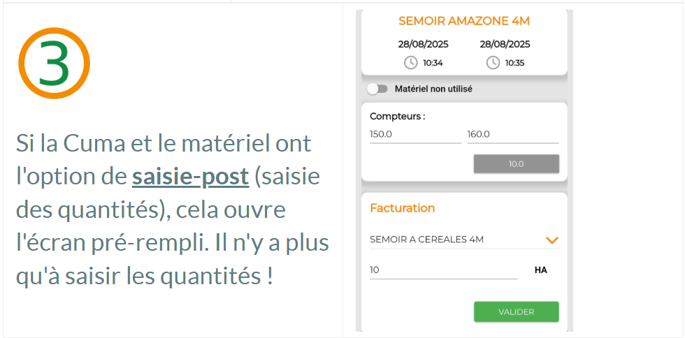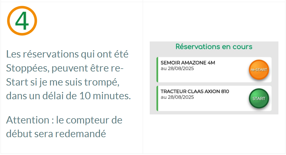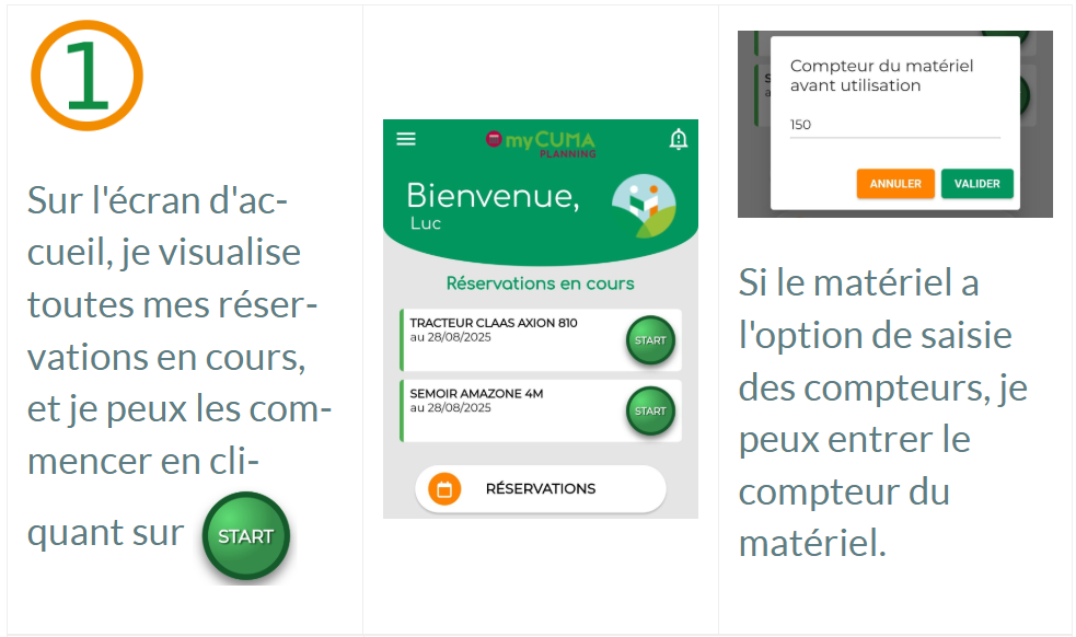 Elle permet de commencer et terminer une réservation en temps réel, et de noter les compteurs pour une aide à la saisie des quantités effectuées.