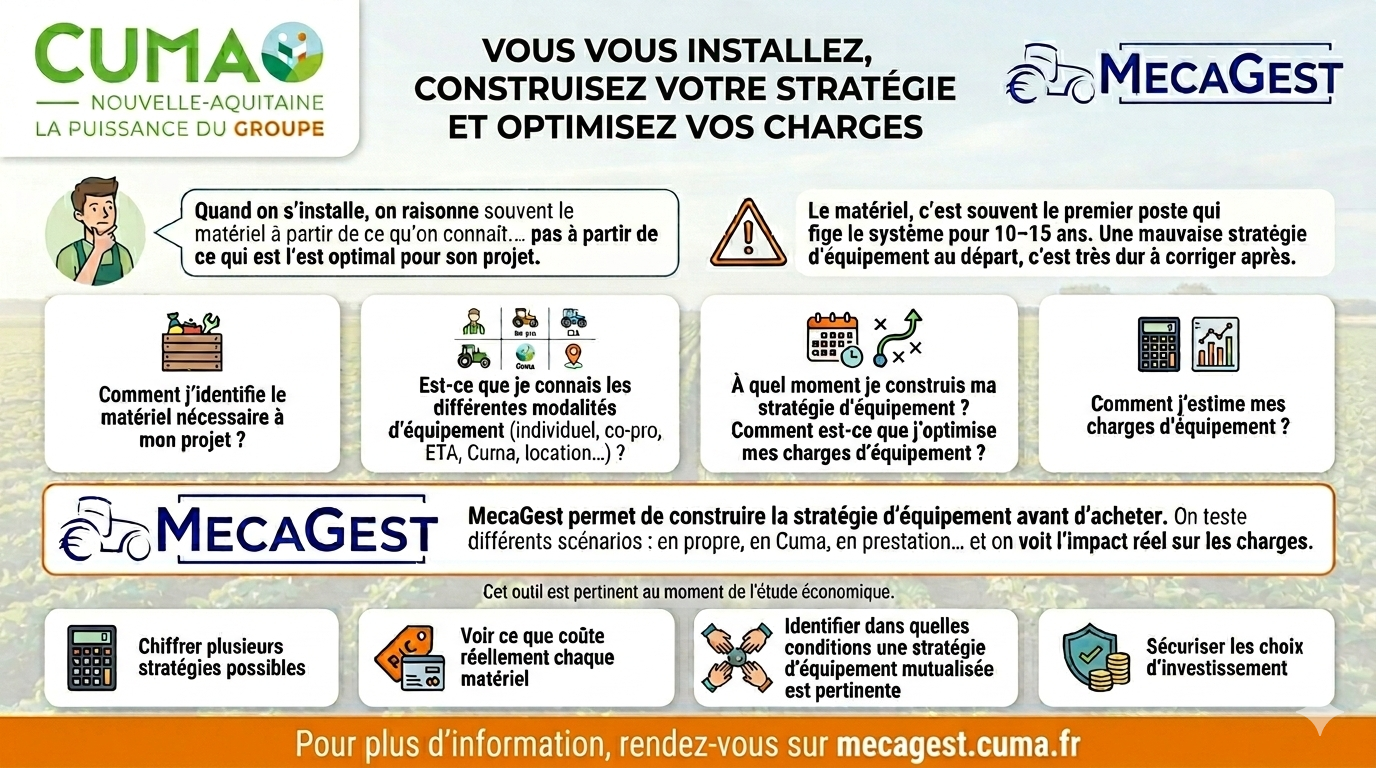 Mais l’outil MECAGEST, ce n’est pas simplement pour ceux qui s’installent, c’est aussi pour ceux qui vont transmettre leur exploitation, mais aussi tout simplement pour ceux qui souhaitent faire un point sur leur niveau de charge de mécanisation et leur stratégie à court/ moyen terme en matière de mécanisation.